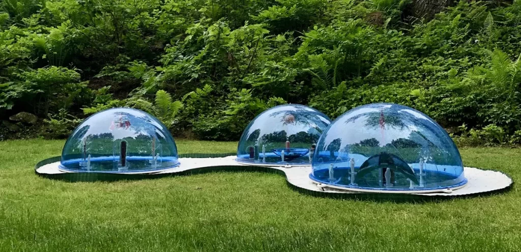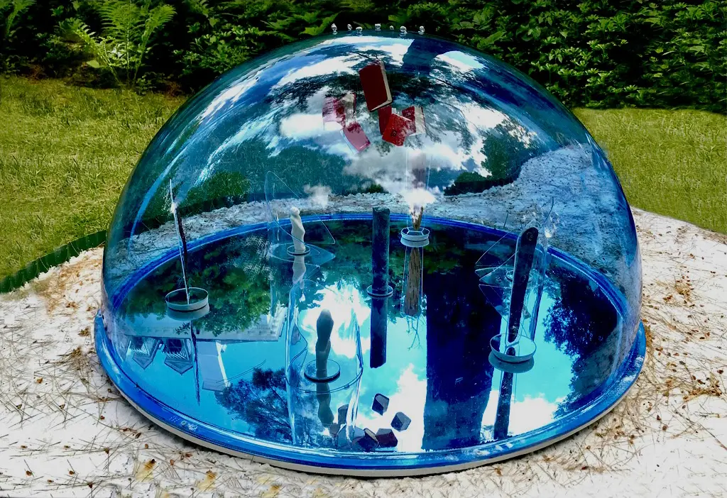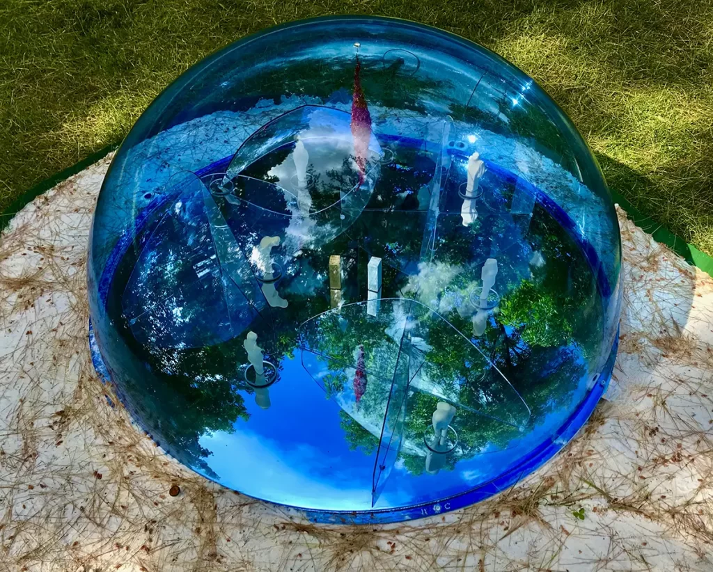 The clouds are reflected from the outside world by the mirror base. The three elements in the center present gold, silver, iron, reminders of planet earth. The people are compartmentalized but can see each other.